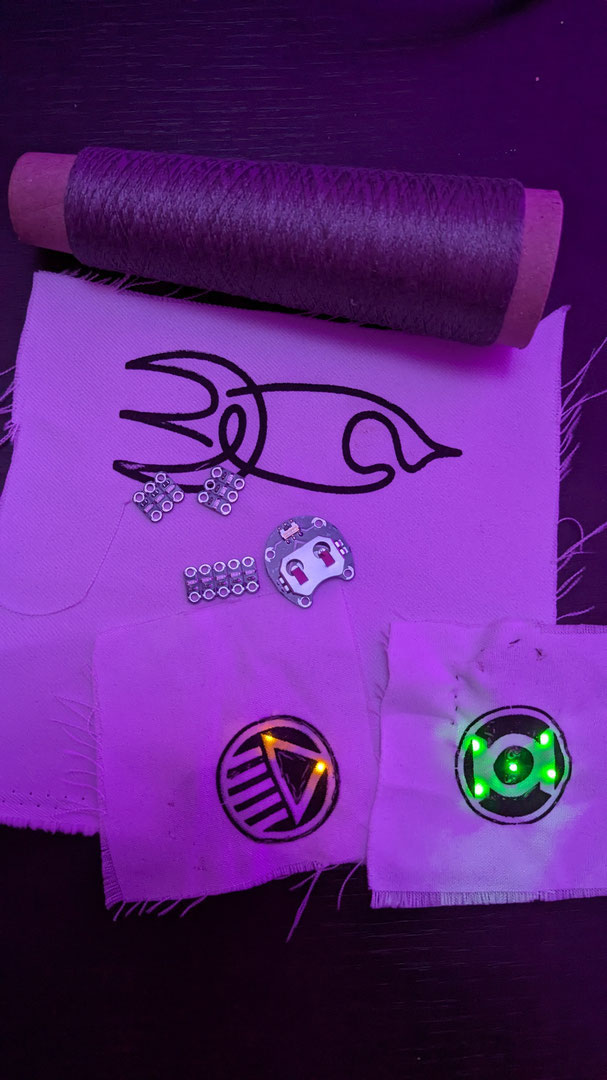 Ich bringe ein paar Patches mit Nerd/ Chaos nahen Motiven, LEDs und andere Materialien mit. Ich näht sie dann auf und bringt sie zum leuchten.